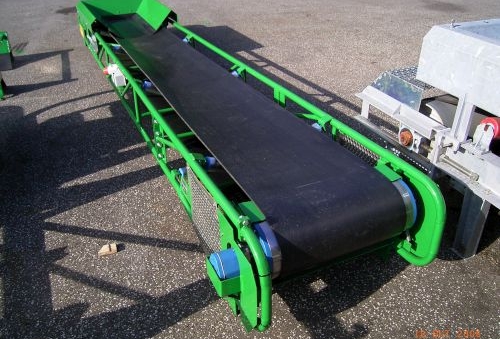 – Lightweight tubular steel frame – Primer and top coat in RAL 6010 (grass green) – Smooth rubber belt type EP 250/2 – 2:1 or 3:1 NQ endless, hot vulcanised ### Rubber steep conveyor belt type EP 250/2 – 3:1.5 NQ with 15 mm V/Y profile endless, cold vulcanised – Inner belt plough scraper